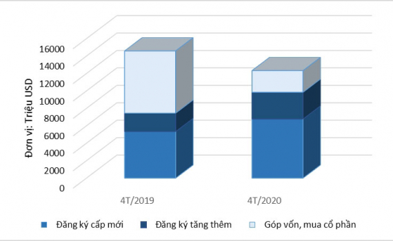 Theo báo cáo của Bộ Kế hoạch và Đầu tư, tính đến ngày 20-4, tổng vốn đăng ký cấp mới, điều chỉnh và góp vốn mua cổ phần của nhà đầu tư nước ngoài (ĐTNN) bốn tháng đầu năm 2020 đạt 12,33 tỷ USD, bằng 84,5% so với cùng kỳ năm 2019.